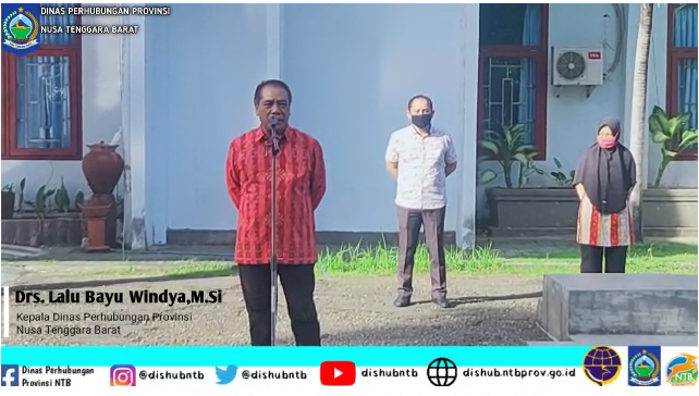 Pagi ini selasa, 26 Mei 2020 Kepala Dinas Perhubungan Provinsi Nusa Tenggara Barat Drs. Lalu Bayu Windya, M.Si mengadakan apel sekaligus pengarahan dan silaturahim kepada seluruh pegawai dengan tetap mengikuti protokol kesehatan antara lain menggunakan masker, cuci tangan dan hal yang paling utama adalah jaga jarak. Dalam pengarahannya beliau menyampaikan selamat hari raya idul Fitri 1441 H minal aidzin walfaizin mohon maaf lahir batin. dalam situasi Pandemi ini kegiatan silaturahim di lakukan dengan tetap mengikuti arahan kesehatan yaitu jaga jarak.