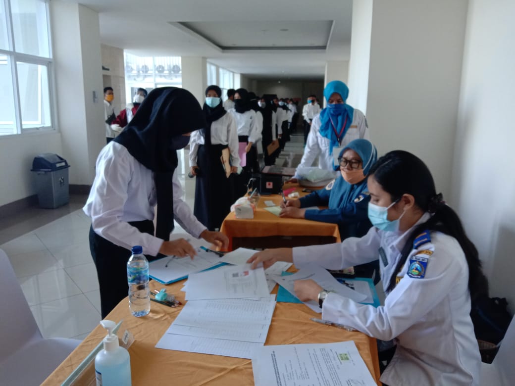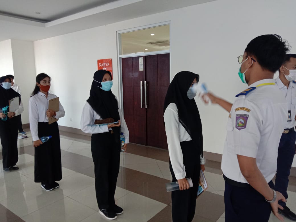 Sesi Registrasi dan Pengecekan suhu tubuh standar Protokol Covid-19 sebelum peserta memasuki ruangan untuk mengikuti psikotest. Masing-masing peserta secara bergiliran dengan menjaga jarak melakukan registrasi berkas pendaftaran dan mengecek suhu tubuh dengan batas maksimal 37,3 °C.