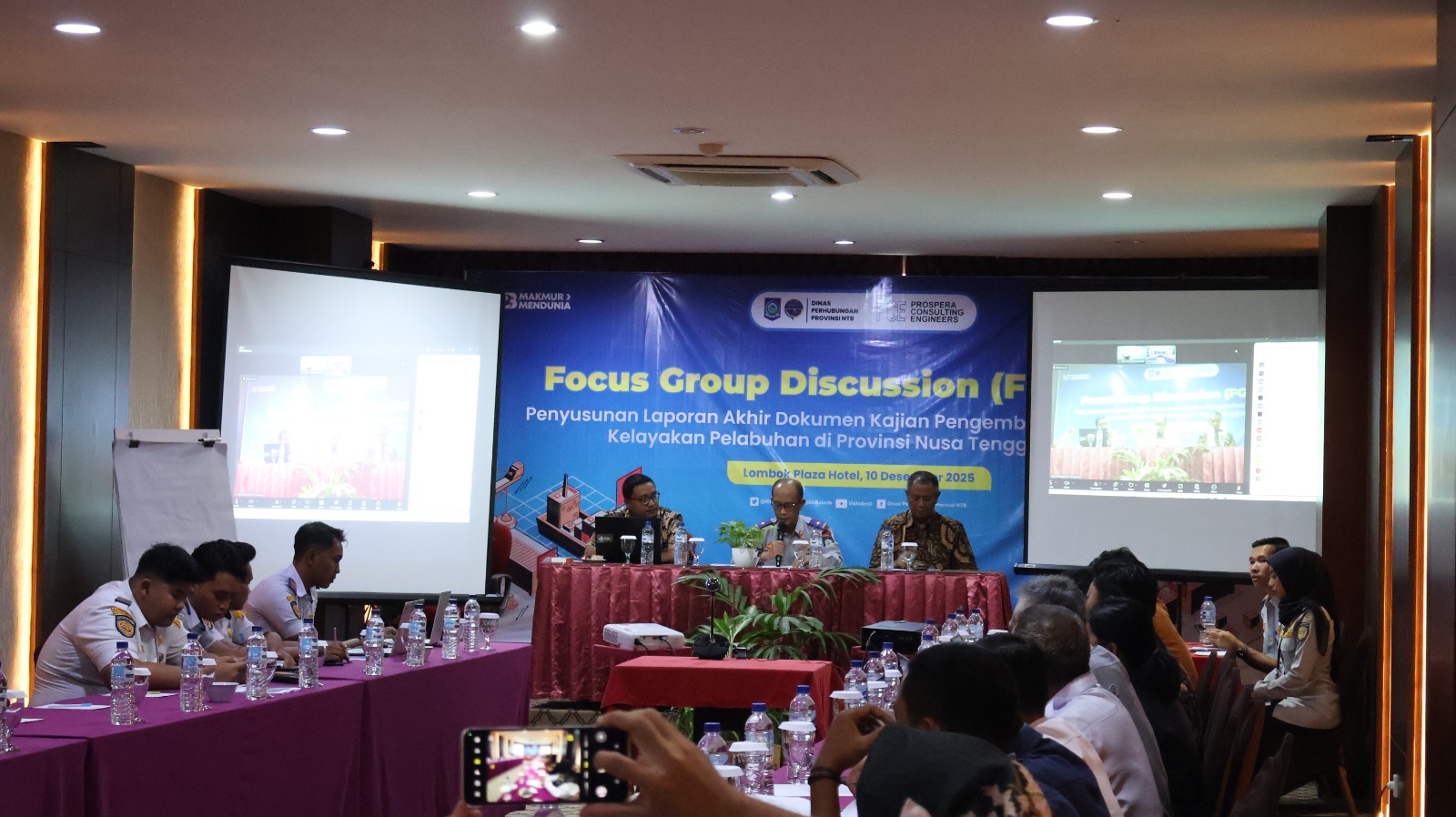 Rabu, 10 Desember 2025, Kepala Dinas Perhubungan Provinsi NTB memimpin kegiatan Focus Group Discussion (FGD) pembahasan laporan akhir penyusunan dokumen kajian pengembangan potensi dan kelayakan pelabuhan di Provinsi Nusa Tenggara Barat.