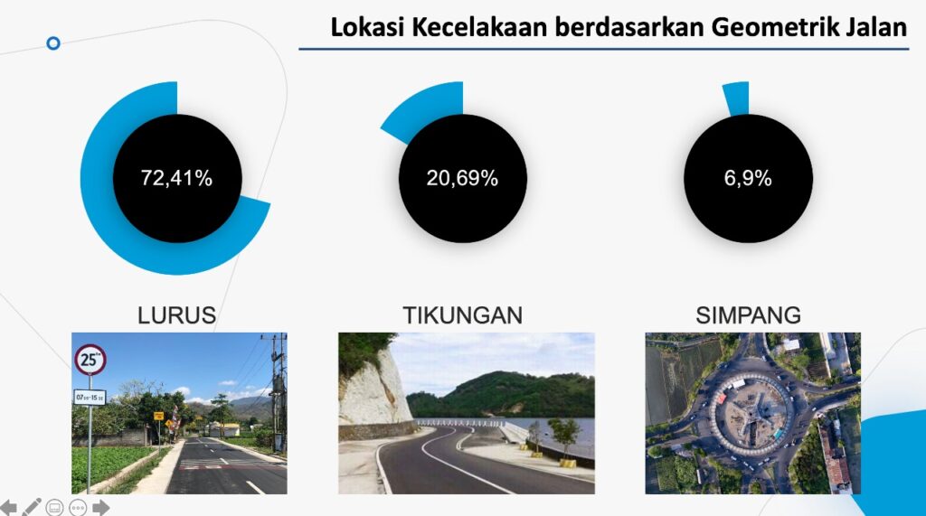 Hal lain yang menjadi perhatian Miq Bayu adalah faktor kesadaran masyarakat kita yang masih sangat kurang. Korban kecelakaan ini rata-rata meninggal dunia karena pada saat berkendara tidak menggunakan helm dan tidak taat pada aturan lalu lintas. Faktor lainnya adalah geometri jalan yang mempengaruhi jumlah kejadian kecelakaan. Miq Bayu melanjutkan penjelasannya, “72% kecelakaan terjadi di jalan lurus, 20% kecelakaan terjadi di tikungan, dan 8% kecelakaan ini terjadi di daerah persimpangan”. Hal ini menunjukkan bahwa jalan lurus dengan persentasi tertinggi sebesar 72% perlu menjadi perhatian kita semua untuk lebih mentaati peraturan lalu lintas, dengan tidak ngebut di jalan.
