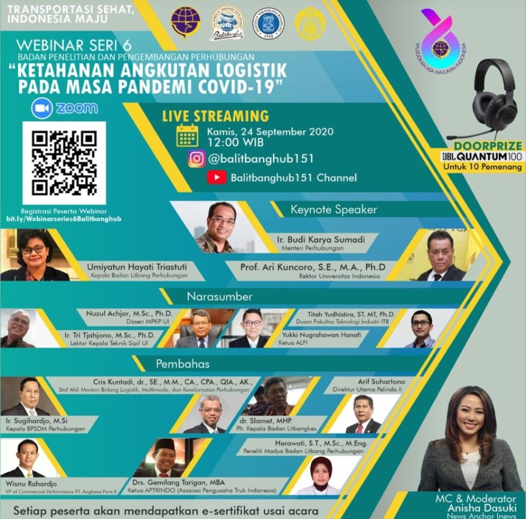 Badan Penelitian dan Pengembangan Perhubungan (Litbang) Kementerian Perhubungan RI menyelenggarakan Webinar Seri #6 dengan tema “ketahanan angkutan logistik pada masa pandemic Covid-19”. Webinar ini menghadirkan Menteri Perhubungan, Rektor Uninversitas Indonesia, dan Kepala Badan Litbang Perhubungan Kemenhub.