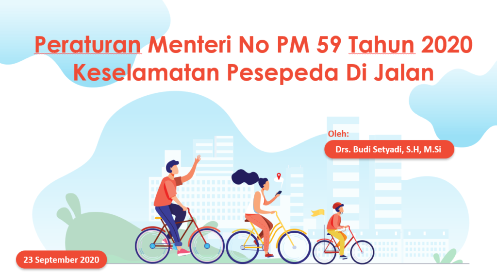 Peraturan Menteri Perhubungan Nomor 59 Tahun 2020 tentang Keselamatan Pesepeda di Jalan telah ditetapkan pada bulan September 2020. Direktur Jenderal Perhubungan Darat telah melaksanakan Sosialisasi PM 59/2020 untuk membahas regulasi terkait sepeda. Kegiatan ini bertujuan untuk meningkatkan pemahaman dan persamaan pandangan para pihak untuk pelaksanaan peraturan ini. Kegiatan Sosialisasi ini dilaksanakan pada Rabu, 23 September 2020 melalui aplikasi Zoom.