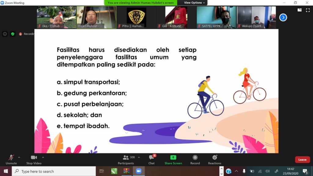 Bapak Dirjen Hubdat Kemenhub, Drs Budi Setyadi, SH., MSi, mengajak seluruh lapisan masyarakat agar “gemar menggunakan sepeda dan sepeda menjadi lifestyle kita sehari-hari”. PM 59/2020 merupakan regulasi pemerintah yang disusun dengan metode bottom up melibatkan para pihak dari pemerintah, komunitas sepeda, dan pakar transportasi. Uji public telah dilaksanakan di Bandung dan Yogyakarta. PM 59/2020 ini selanjutkanya akan dilakukan harmonisasi dengan kementerian terkait lainnya seperti Kementerian PUPR, dan Sekretariat Kabinet. Hal yang atur adalah persyaratan teknis sepeda, tata cara bersepeda, dan fasilitas pendukung sepeda. Tujuan pengaturannya adalah untuk mewujudkan tertib berlalu lintas dan menjamin keselamatan penggunaan sepeda di jalan.