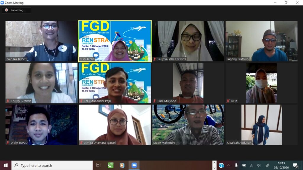 Pada hari Sabtu (03/10/2020) Dinas Perhubungan Nusa Tenggara Barat melaksanakan Focus Group Discussion (FGD) membahas Review Renstra 2019-2023 via ZoomMeeting. Kegiatan FGD tidak hanya dihadiri oleh Dinas Perhubungan Prov. NTB, juga turut mengundang Dinas Perhubungan Kota Mataram, Dinas Perumahan Rakyat dan Kawasan Permukiman Prov. NTB, BAPPEDA Prov. NTB, TGP2D, serta akademisi dari Fakultas Teknik Universitas Mataram yaitu Bapak Made Mahendra.